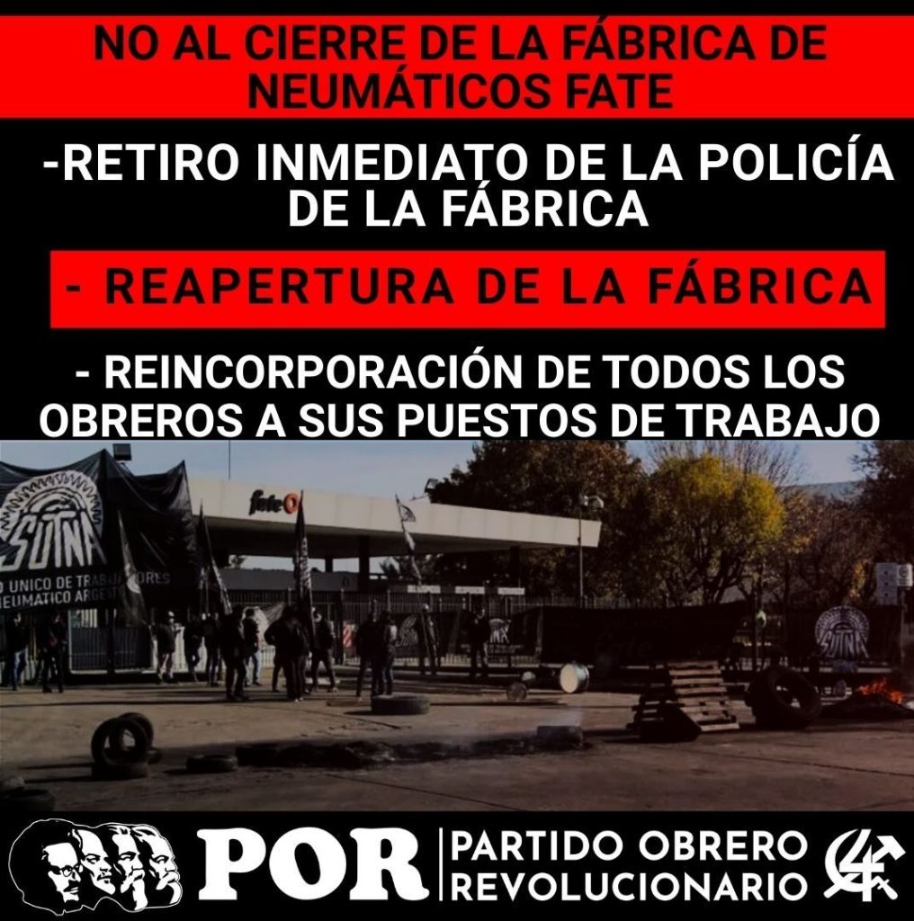 La clase obrera debe encabezar, con sus propios métodos de lucha, la defensa de los trabajadores de Fate e impedir su cierre, y defender a los miles y miles de trabajadores despedidos de todos los establecimientos que están cerrando, exigir el proteccionismo de la industria, cerrando las importaciones de todos los productos que se pueden producir en el país. Es imprescindible y es urgente terminar con este Gobierno antinacional y antiobrero que destruye lo que queda de la industria nacional.