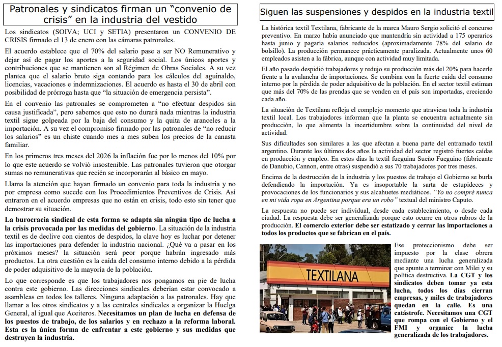 Lo que corresponde es que los trabajadores nos pongamos en pie de lucha contra este gobierno. Las direcciones sindicales deberían estar convocado a asambleas en todos los talleres. Ninguna adaptación a las patronales. Hay que llamar a los otros sindicatos y a las centrales sindicales a organizar la Huelga General, al igual que Aceiteros. Necesitamos un plan de lucha en defensa de los puestos de trabajo, de los salarios y en rechazo a la reforma laboral. Esta es la única forma de enfrentar a este gobierno y sus medidas que destruyen la industria.